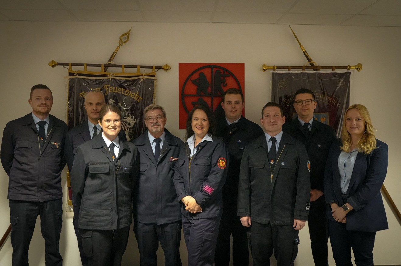 (Jens Rodenhäuser - Stellv. Wehrführer, Frank Bieber - Rechner, Selina Schwanke - Beisitzerin, Hans-Werner Frey - Beisitzer, Nicole Poth - Schriftführerin, Torben Czettl - Jugendfeuerwehrwart, Michael Fischer - Wehrführer, Alexander Gierl - stellv. Vorsitzender, Luisa Reich - 1. Vorsitzende)